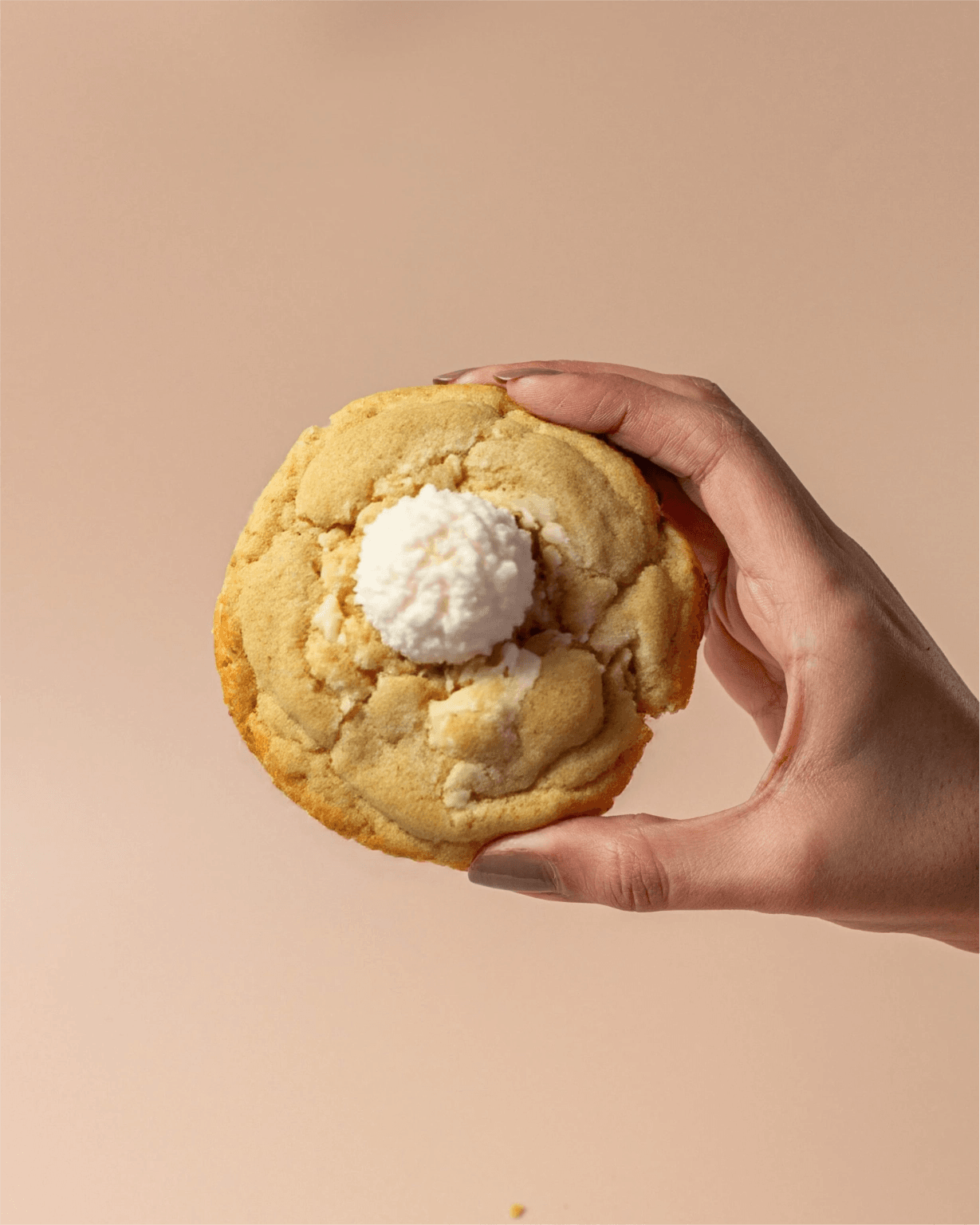 Delicate belgian white chocolate cookie with coconut flakes, almond pieces, and a smooth white chocolate center. Light, elegant, and utterly delicious.